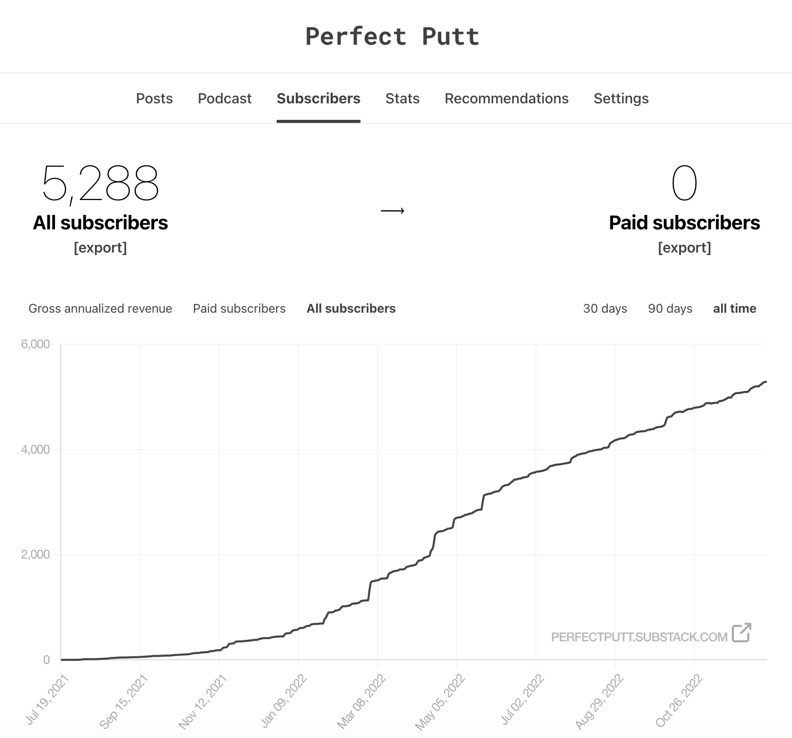 Perfect Putt started 2022 with 507 subscribers and now has over 5,200. A majority of subscribers have come from Twitter.