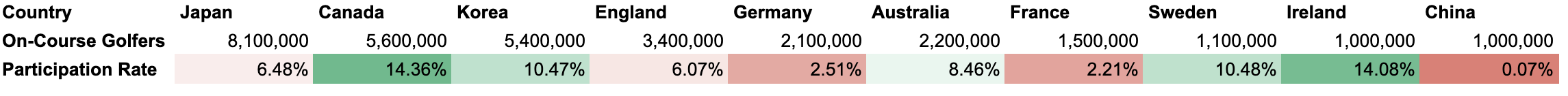 Canada and Ireland have the highest participation rates, at 14%. This means that for every 100 people living in each country, 14 play golf. Both countries have nearly double the on-course participation rate of the United States.