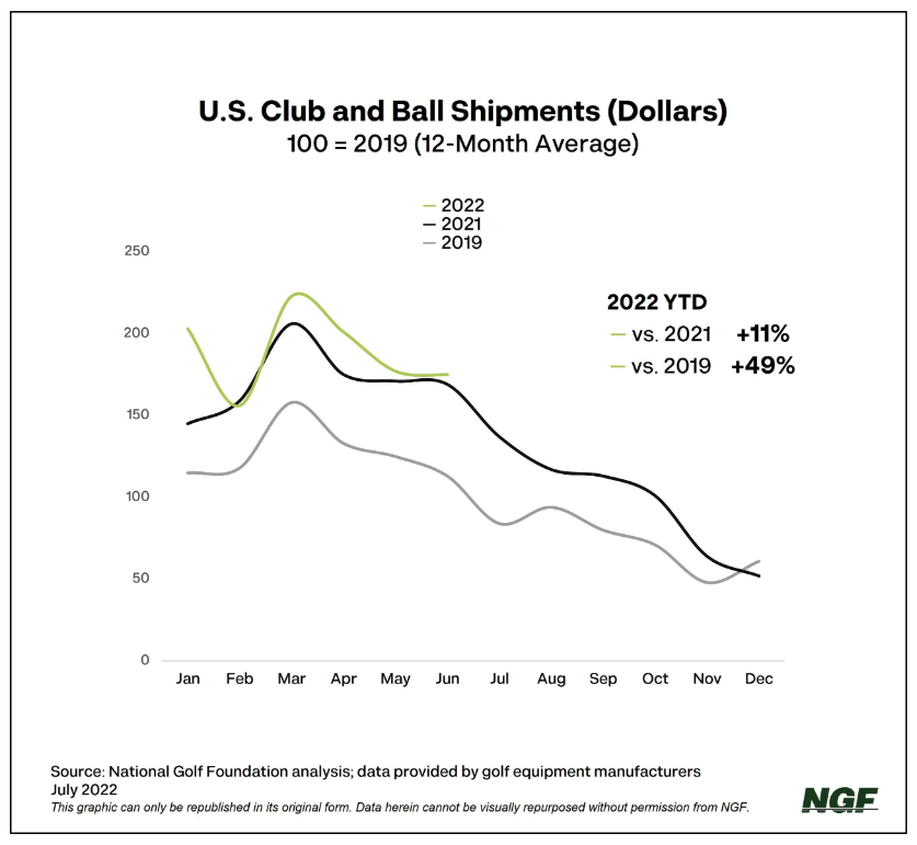 2022 has seen an 11% increase versus 2021 and a 49% increase versus 2019. Keep in mind — the report doesn’t consider inflation. The most recent reading of inflation was June — 9.1%. Nonetheless, still favorable for the golf industry.