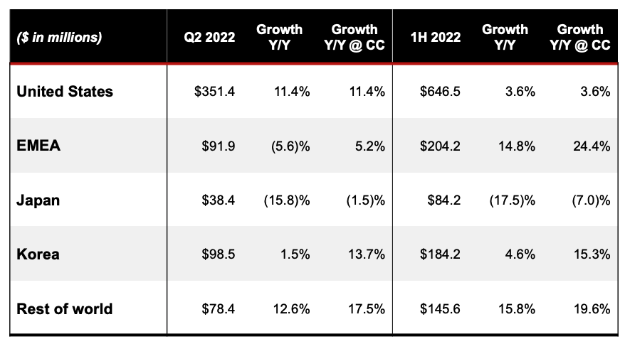 From a region standpoint — The United States was up 11.4% for the second quarter. Japan sales were down 15.8% due to supply chain and fulfillment constraints.