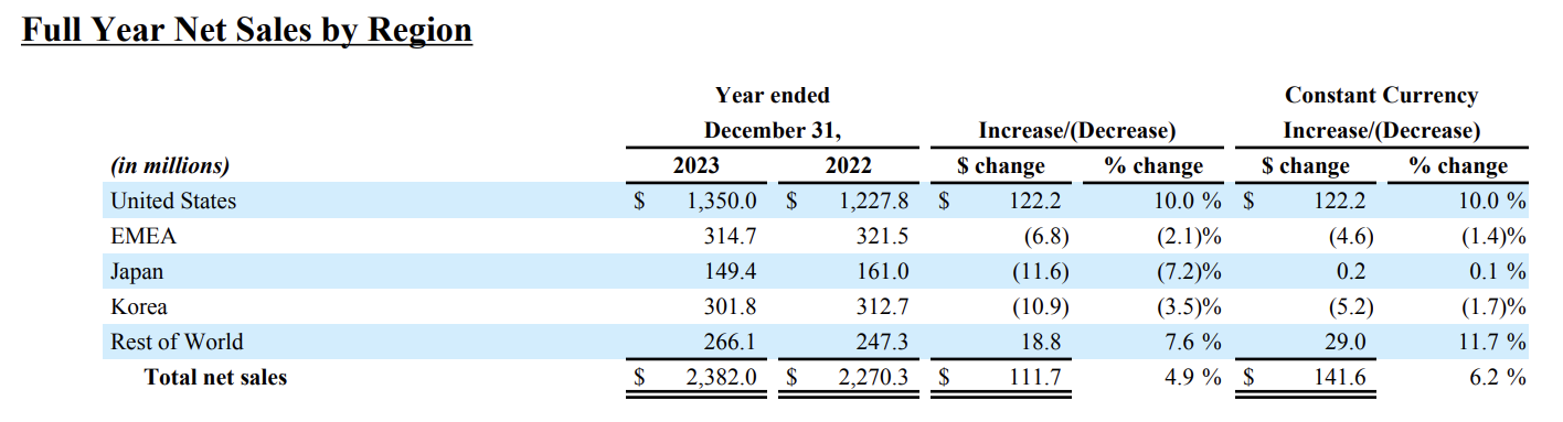 - United States revenue is the largest region of Acushnet — making up 57% of revenue. And it was their highest revenue growth region of 2023.