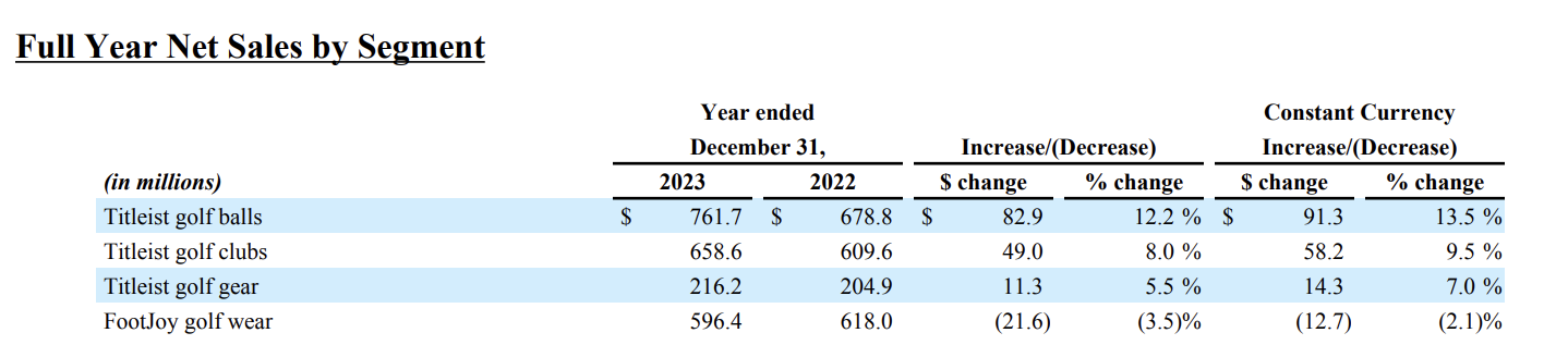 - Golf ball revenue is the largest segment of Acushnet — making up 32% of revenue. And it was their highest revenue growth segment of 2023.