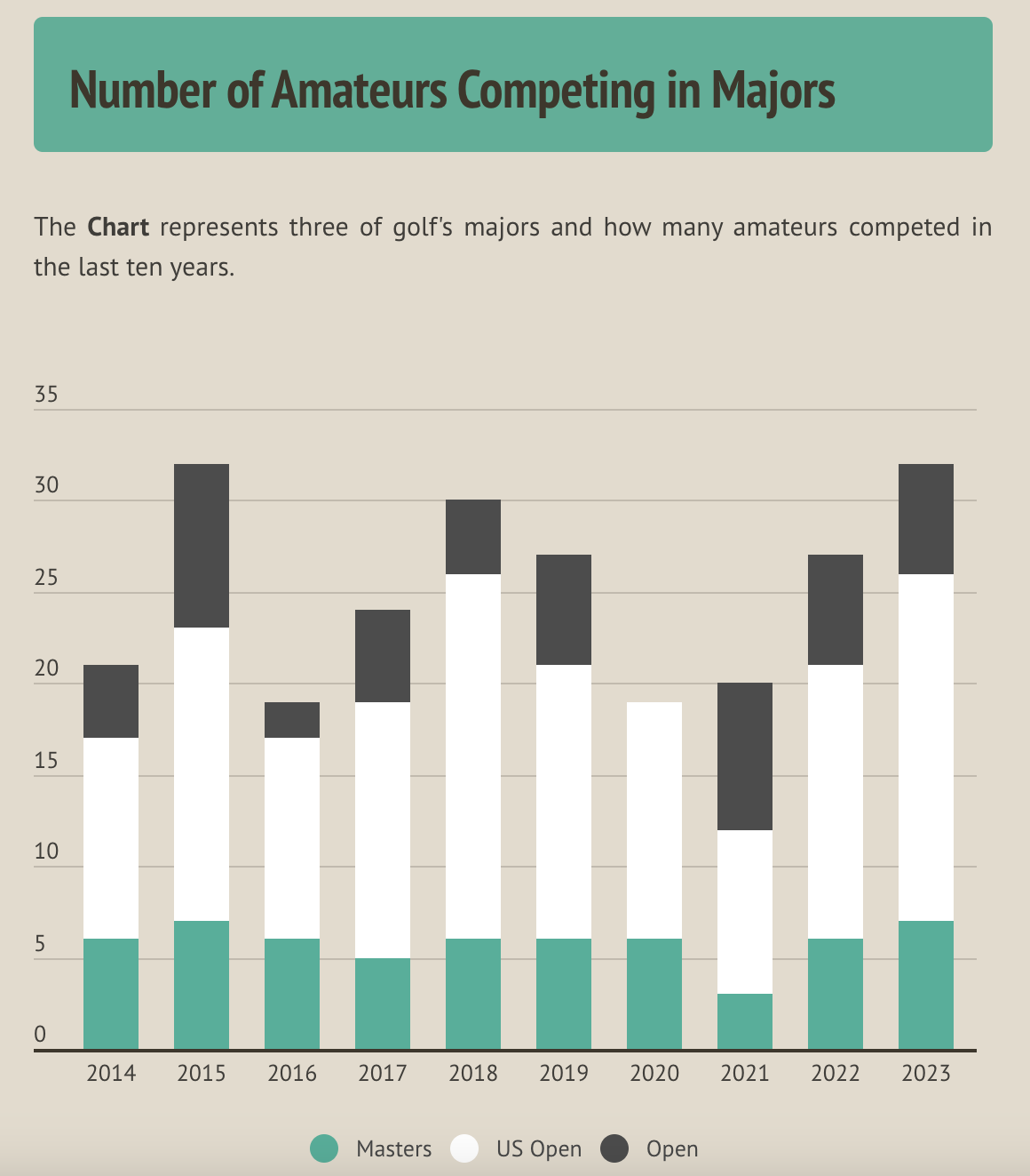 While the Masters averages six amateur competitors per year, fields in the Masters are typically around 90 golfers — meaning 7% of competitors are amateurs.