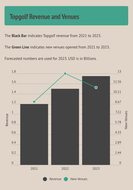 Topgolf has been on a run for the last few years. Forecasted revenue for 2023 is $1.75 billion — an increase of over $500 million since 2021.