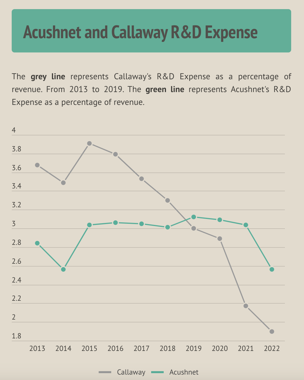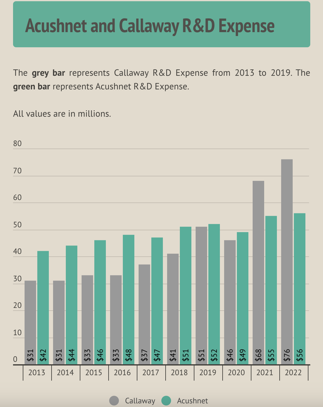 Acushnet and Callaway are both public companies — we can look at their R&D expenses over time to see if they tell us a story.