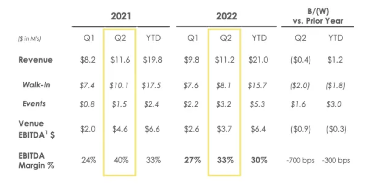 Drive Shack’s 2022 second-quarter revenue declined versus second-quarter revenue in 2021. And EBITDA margins started to slip. For some context — Topgolf grew same venue revenue by 8% in that period.