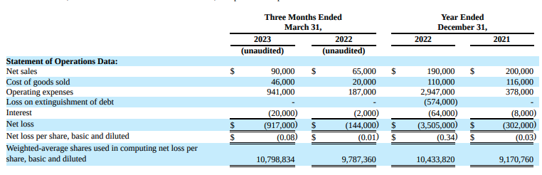 The company did $190,000 in revenue in 2022 and had operating expenses of $2.9 million. Sacks Parente had a net loss of $3.5 million in 2022 with $171,000 in cash.