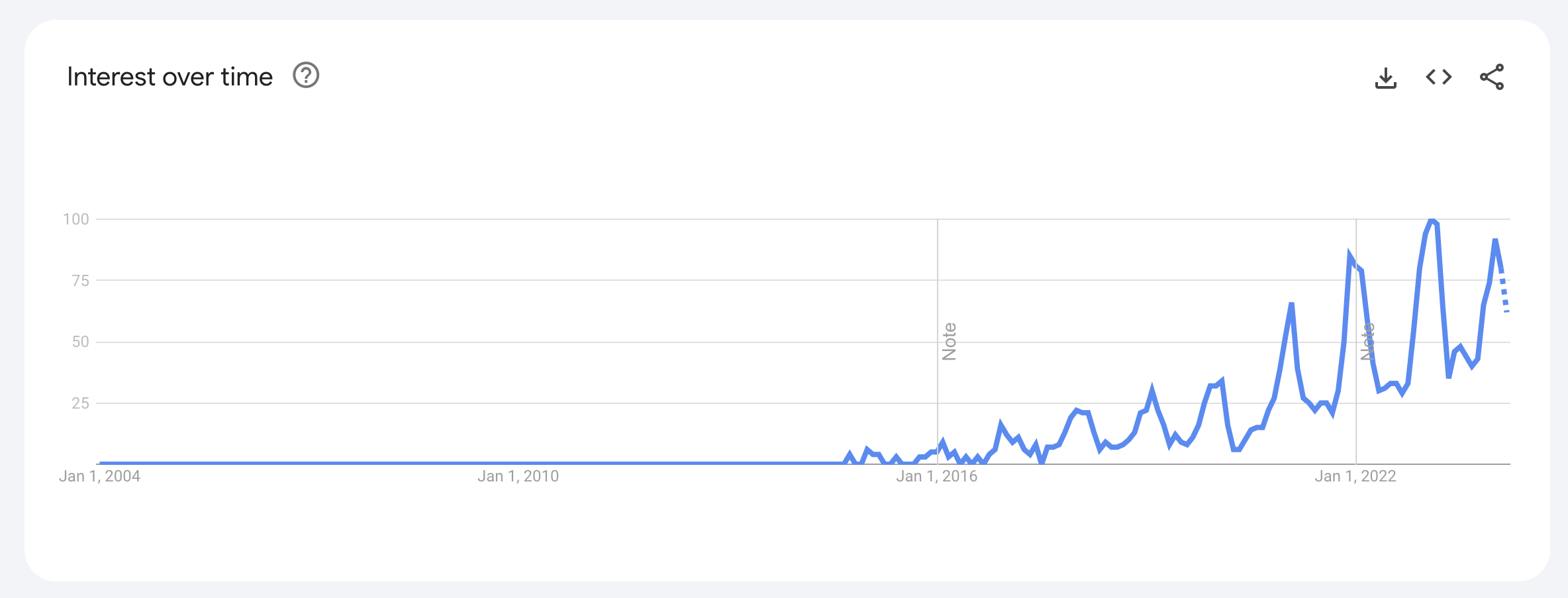 Search interest has tripled since 2019. The United States has the highest region of interest, followed by Canada and the United Kingdom.