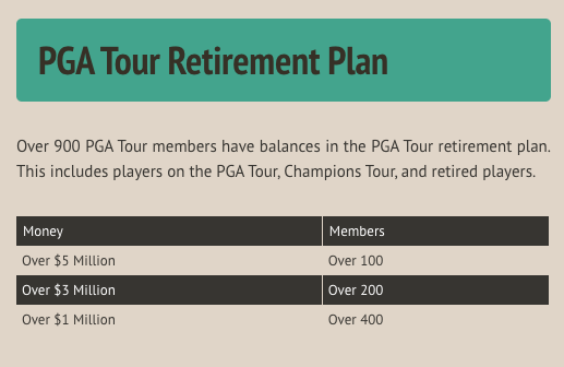 The PGA Tour has approximately 900 members with balances in the retirement plan. Including over 100 that have balances greater than $5 million.