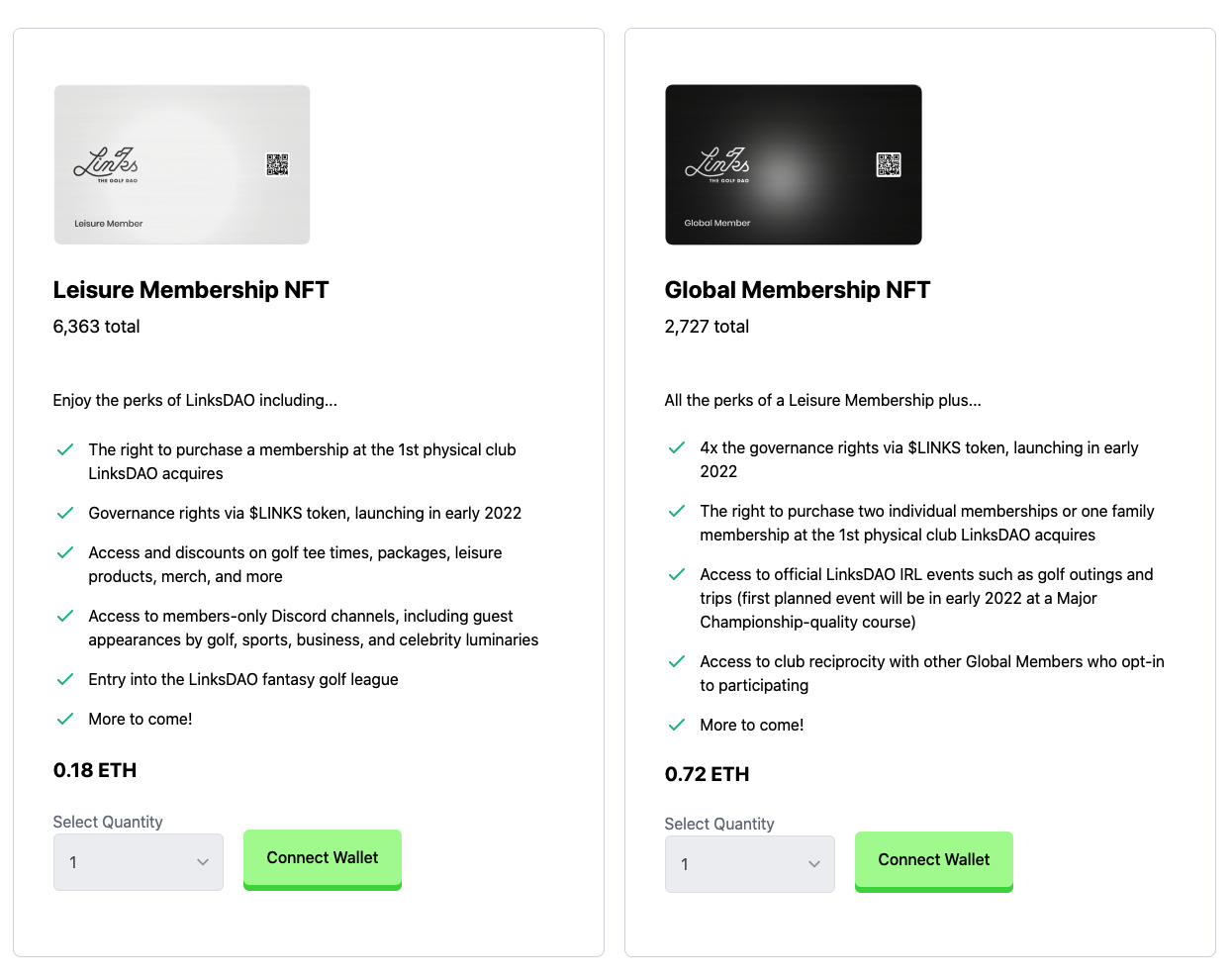 It is important to note; both membership NFTs do not include membership to a future golf course LinksDAO purchases. However, the membership provides the right to purchase a membership in the future. LinksDAO will be making a separate NFT sale in 2022 to fund and support an acquisition.