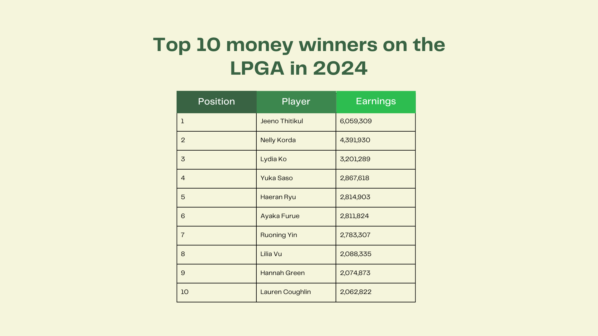 Here’s a look at the LPGA Tour's top ten earners from 2024 — all made over $2 million.