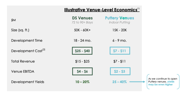 Drive Shack’s development cost is in line with Topgolf’s expectations. They estimate between $25 million and $40 million per location with expected revenue of $15 million - $25 million per venue and an expected venue EBITDA of $4 million - $6 million.