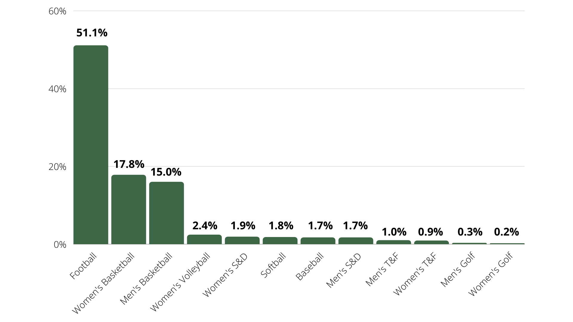 Football leads the way with 51.1% of the total compensation of NIL deals. Men’s Golf has received 0.3% of the total compensation, and Women’s Golf has received 0.2%. They rank 19th and 21st, respectively.