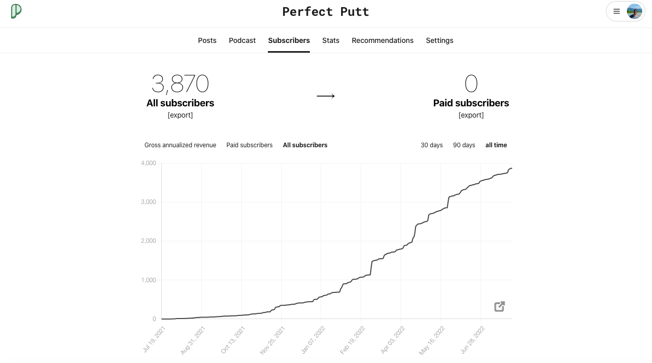 Subscriber growth without an audience is hard. I wrote eleven Perfect Putt newsletters before I had 100 subscribers. It was a weekly grind — I would get anywhere from 5 - 10 new readers.