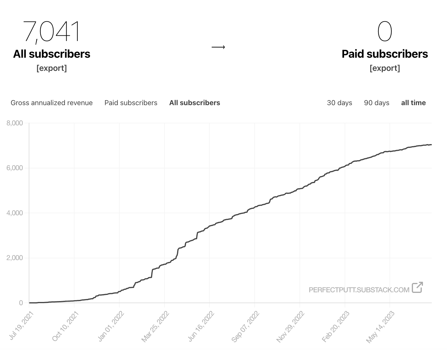 Perfect Putt ended 2022 with 5,289 free subscribers — it has grown 33% this year. My goal for the end of 2023 was to reach 10,000 free subscribers. I am behind where I want to be, and I know it is because I haven’t done a good enough job on social media and with the newsletter. I need to give it a better effort — we need to keep working at it.
