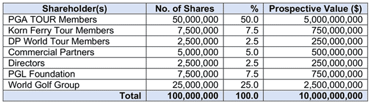 - PGA Tour voting member — 200,000 shares ($20 million valuation)