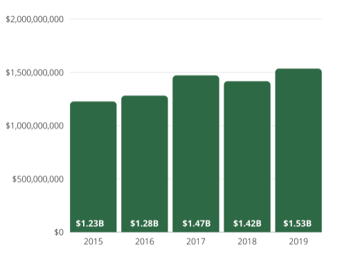 The PGA Tour is in a healthy spot from a financial standpoint. Here is a breakdown of revenue from 2015 to 2019. The PGA Tour forecasted revenue of $1.52 billion in 2022.