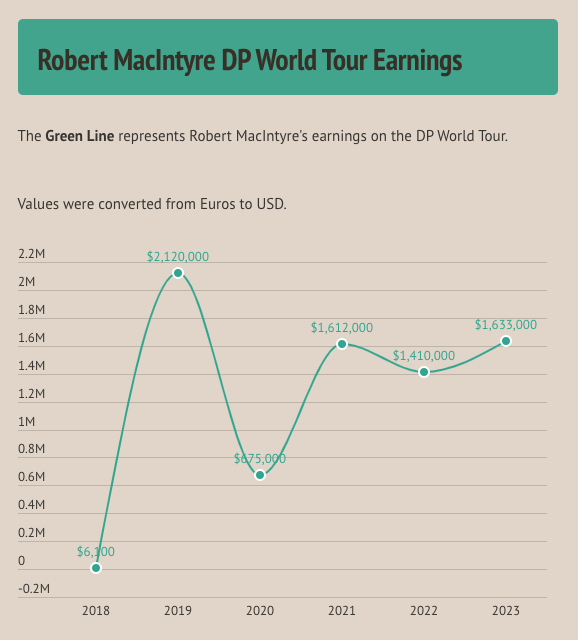 MacIntyre has made a little over 7 million Euros during his career on the DP World Tour. Depending on conversion rates for each year — it would be around $7.5 million.