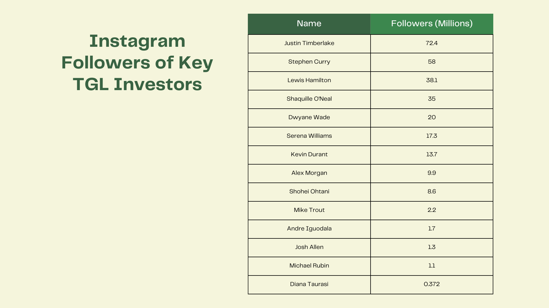 TGL investors are filled with athletes and celebrities. They also happen to have large audiences on social media.