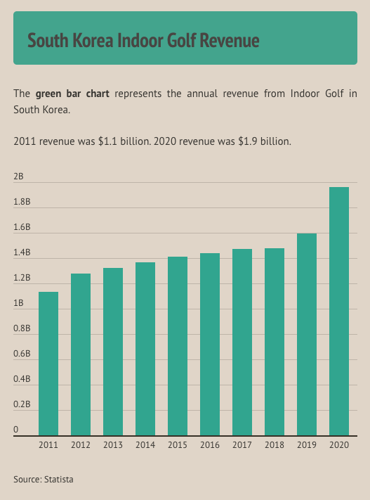 The indoor golf market appeals to golfers that may not be able to play golf 12 months out of the year due to weather — or geographically challenged locations like South Korea.