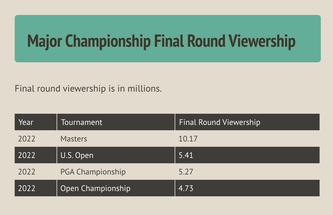 The PGA Championship is in the beginning stages of a media deal with ESPN and CBS that runs through 2030. The tournament had the third-highest TV ratings of the major championships in 2022, with 5.27 million viewers during the final round.