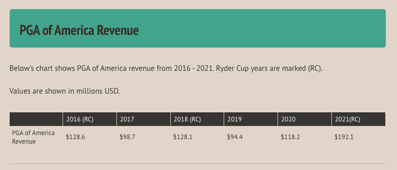 And comparing the 2021 year for the PGA of America to the previous year of no Ryder Cup (take 2020 out of the equation) was 2019. The PGA of America recognized $94 million in revenue and $68 million in tournament revenue.