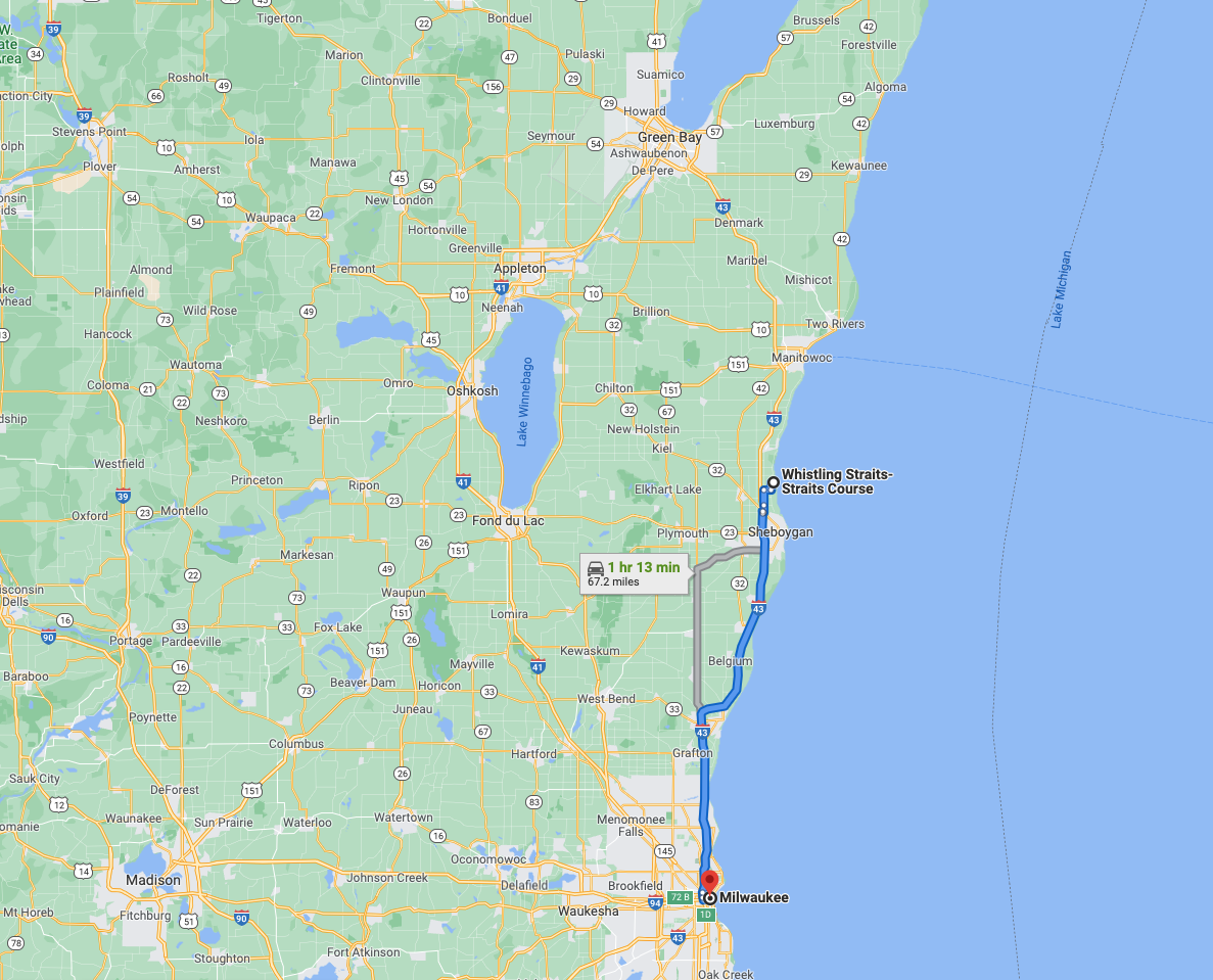 Whistling Straits is more than 50 miles south of Green Bay and more than 60 miles north of Milwaukee.