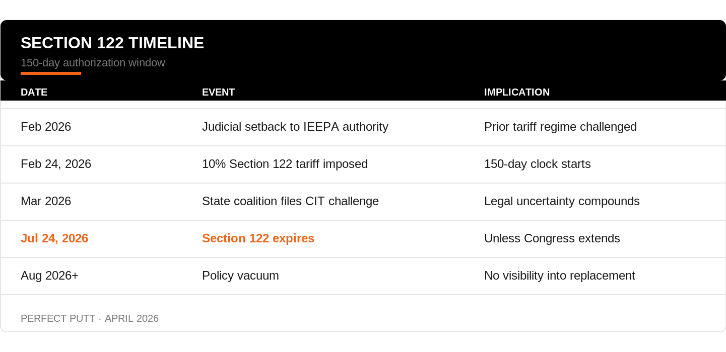 The golf industry's biggest equipment makers are budgeting well over $100 million in tariff costs for 2026. That is real margin being extracted from an industry still finding its footing after years of pandemic-era volatility, supply chain disruption, and consumer price fatigue. The 10% Section 122 duty runs through July 24 with no visibility into what follows. OEMs cannot confidently price procurement when the policy may simply evaporate. The tariff is a cost. The uncertainty is the real tax.