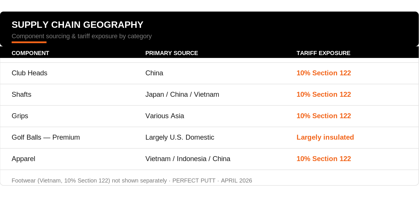 Ball production provides partial domestic insulation. Clubs do not. Hardgoods are overwhelmingly sourced from China, Indonesia, Thailand, and Vietnam. For OEMs managing capital structure transitions or upcoming earnings windows, the tariff compounds already-complex financial positioning.
