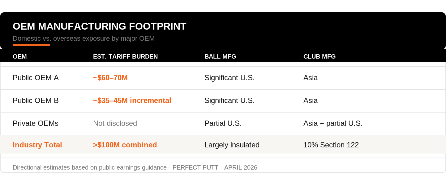 Golf balls are the bright spot. Several major OEMs maintain significant domestic ball production in Massachusetts and South Carolina, which reduces tariff exposure on their highest-margin consumable line. The degree of insulation varies by manufacturer, but the product category is partially shielded.