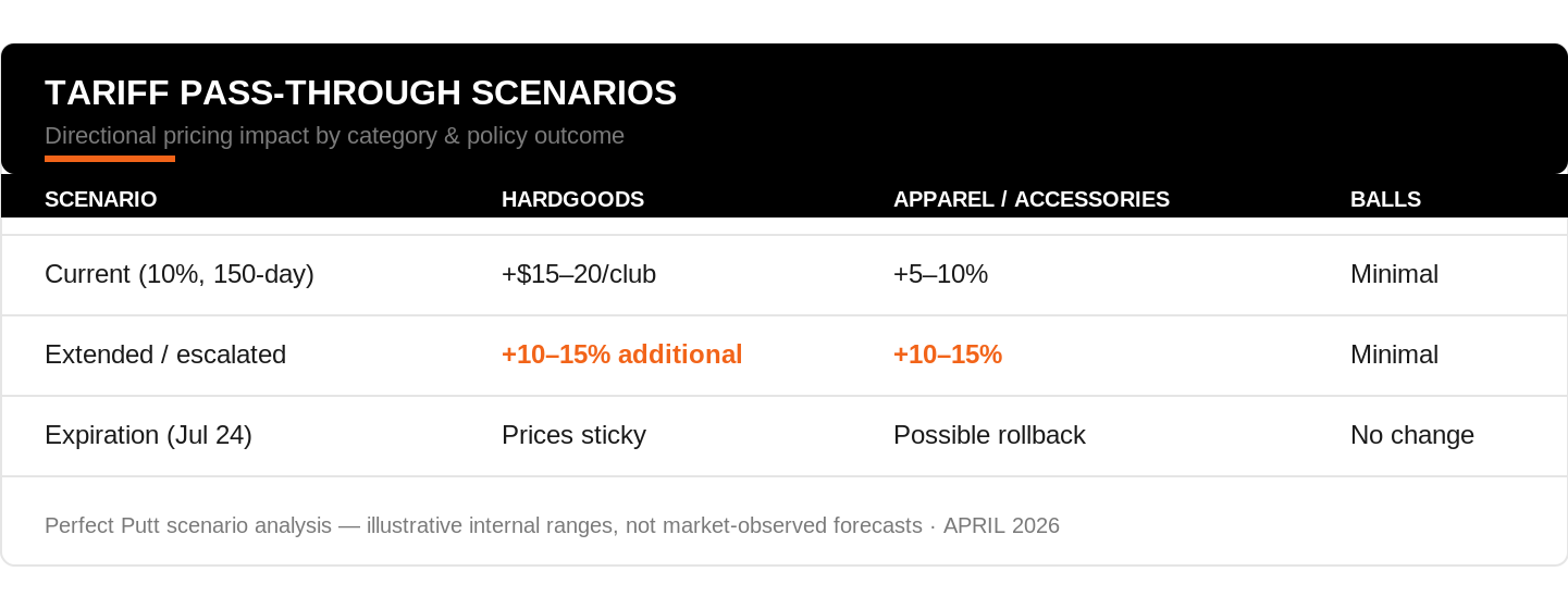Private manufacturers do not disclose exposure, but their clubs come from the same Asian geographies. The private structure shields them from quarterly earnings pressure — a real advantage here. Across the industry, initial price increases of $15 to $20 per club are already in market. Every OEM is running the same math with different levels of visibility.