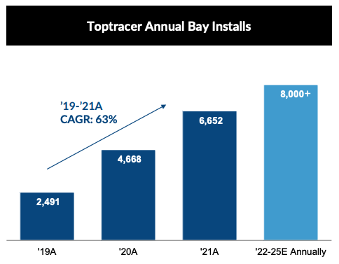 Toptracer’s CAGR for bay installs from 2019- to 2021 is greater than 60%.