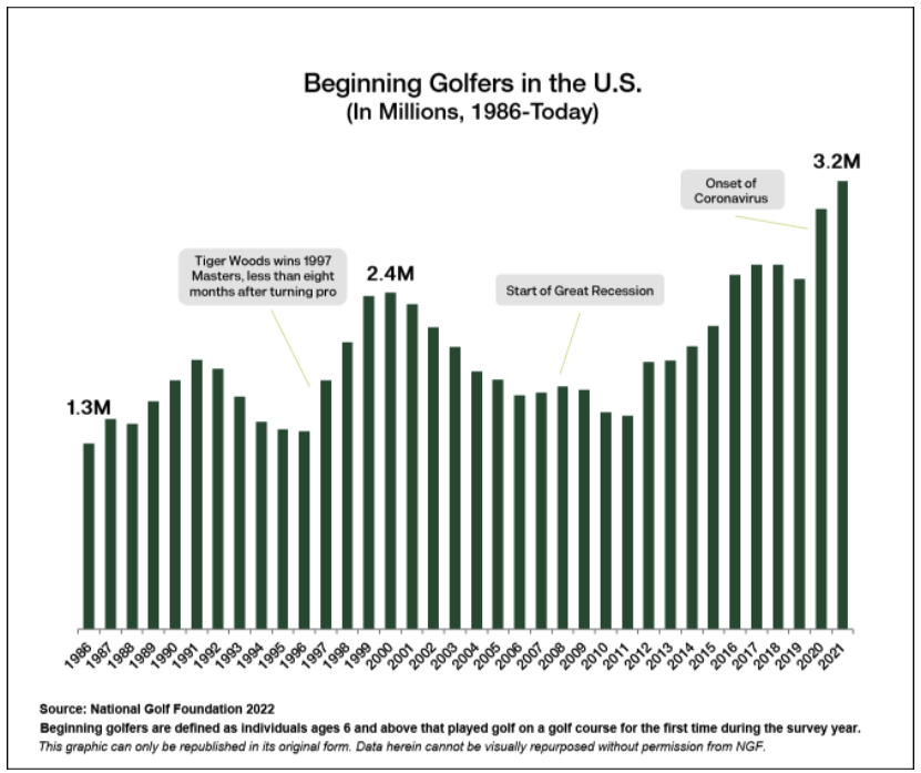 Golf has been booming the last two years, in large part due to the pandemic. According to the National Golf Foundation, a record 3.2 million Americans played the game on a golf course for the first time in 2021. The 2021 growth was on the heels of 3 million Americans playing golf for the first time in 2020.