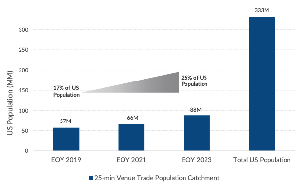By the end of 2023, Topgolf estimates that it will have a venue within a 25-minute drive of 26% of the United States population, leaving a staggering 74% of the United States population for future growth.